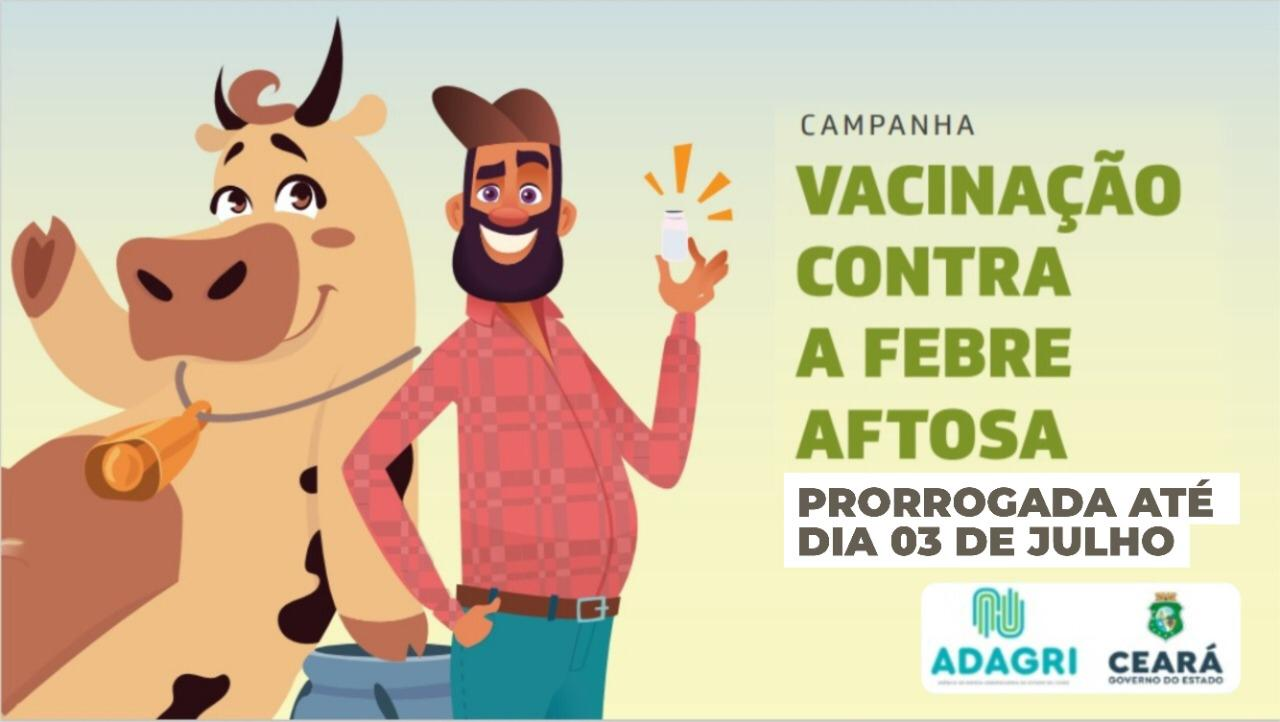 A primeira etapa da Campanha de Vacinação contra Febre Aftosa do Ceará foi prorrogada até o próximo dia 3 de julho. A data limite para declarar a vacinação também foi prorrogada para o dia 19 de julho de 2021. A Agência de Defesa Agropecuária do Ceará (Adagri), vinculada da Secretaria do Desenvolvimento Econômico e Trabalho (Sedet), responsável pela Campanha, informa que a prorrogação foi motivada pela dificuldade na aquisição das vacinas provocada pela Pandemia da Covid 19.