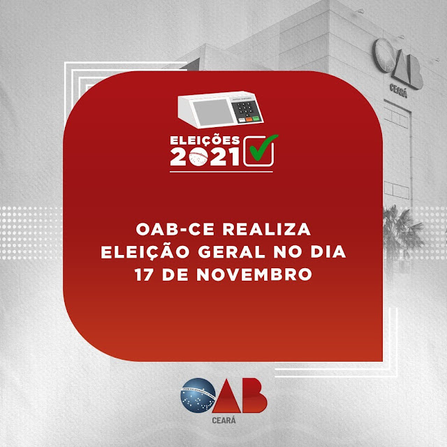 A Eleição OAB Ceará, para o triênio 2022-2024, será realizada no dia 17 de novembro, das 8h às 16h, em todo o Estado. Em Fortaleza, o local de votação é o Centro de Eventos do Ceará (Pavilhão leste, Portão D, 1° mezanino). No interior do Estado, a votação será nas dependências das respectivas sedes das Subsecções ou em outros lugares previamente divulgados.
